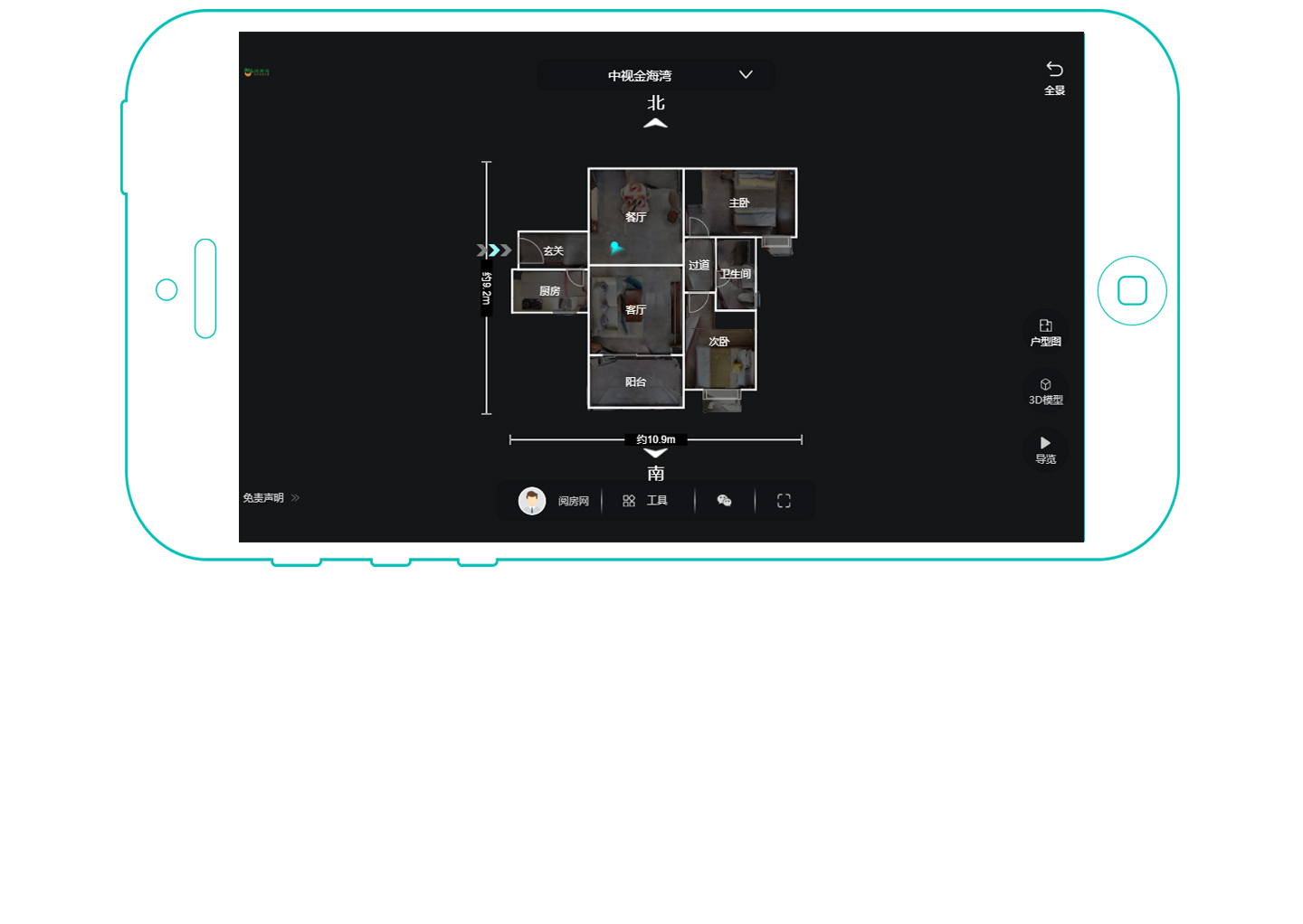 >> 用户可点击相关导航功能,例如户型图、3D模型、导览、标尺等,去观看测量该房屋的所有图像信息。